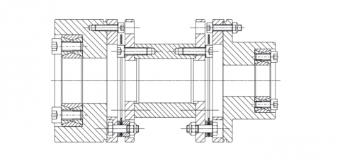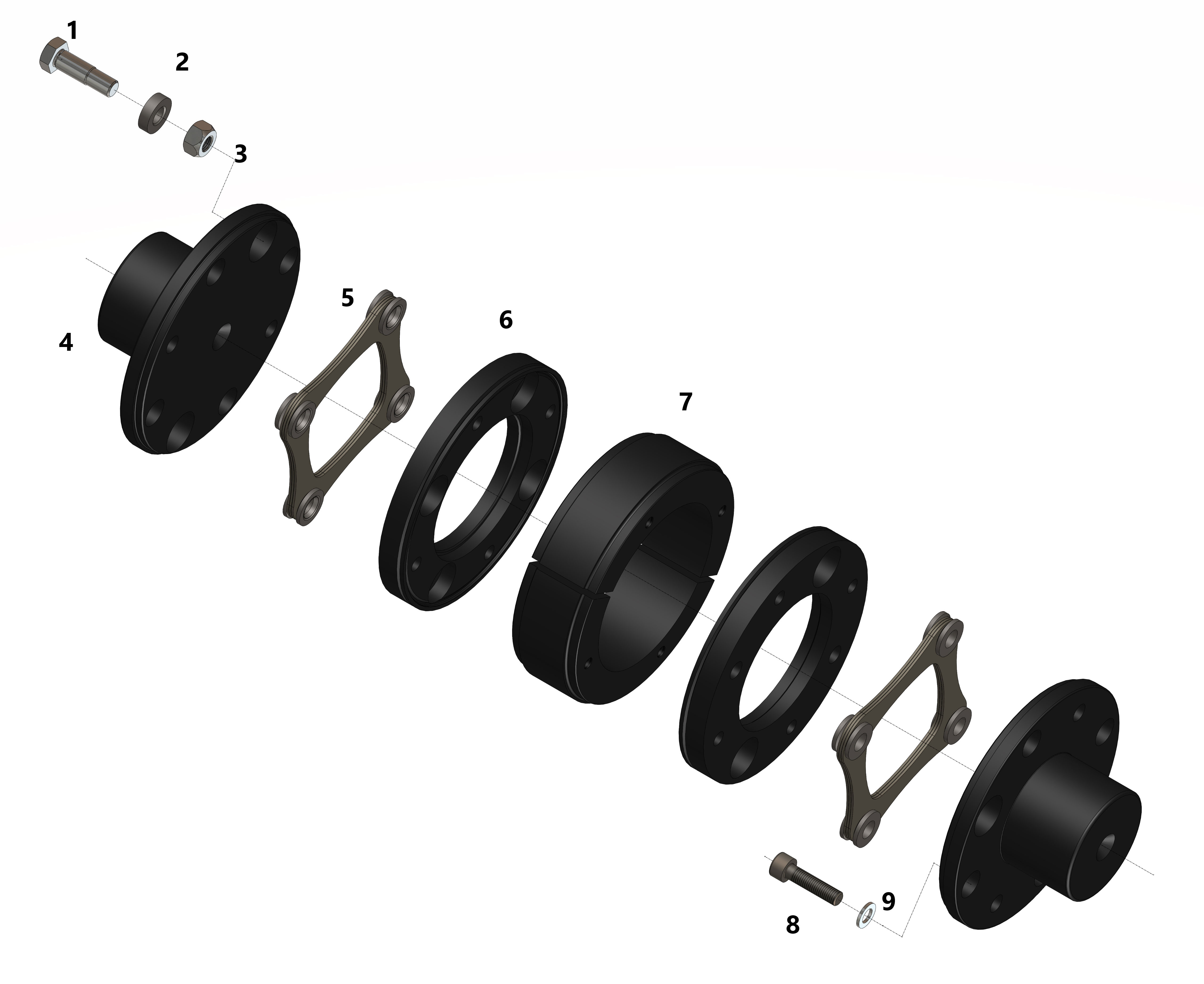 The total torque capacity depends on the disc pack thickness, total number of drive bolts and their bolt circle. Disc couplings will in most cases have two flexible elements and a spacer. As all parts are positively connected, this disc coupling ensures good inherent balancing properties and is hence often used at motor speeds without additional balancing.